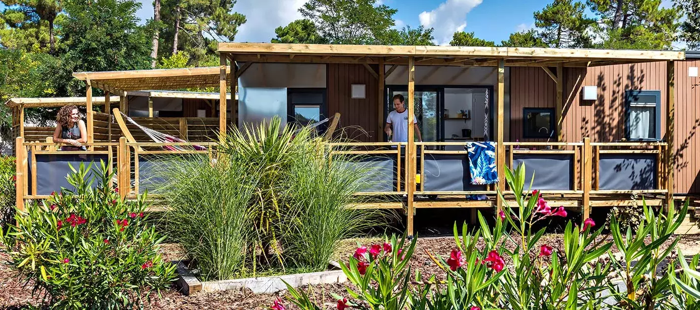 At all of our campsites on the Atlantic west coast of France, you can rent high-end mobile homes designed to meet all your expectations. Our mobile homes can accommodate up to 8 people and are the ideal accommodation for family holidays in France, whether it's for several nights, a week, or more. Each mobile home is equipped with 2 or 3 bedrooms, 1 or 2 bathrooms, a fully equipped kitchen including a refrigerator, cooking hobs, a microwave, and all the essential utensils for preparing good meals. Additionally, each accommodation has a wooden terrace with its own garden furniture. Renting a holiday home in one of our South Atlantic campsites is the perfect solution for a great stay in France.